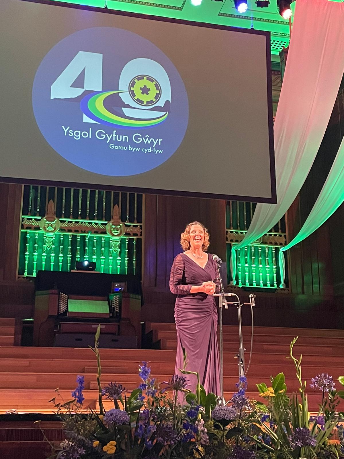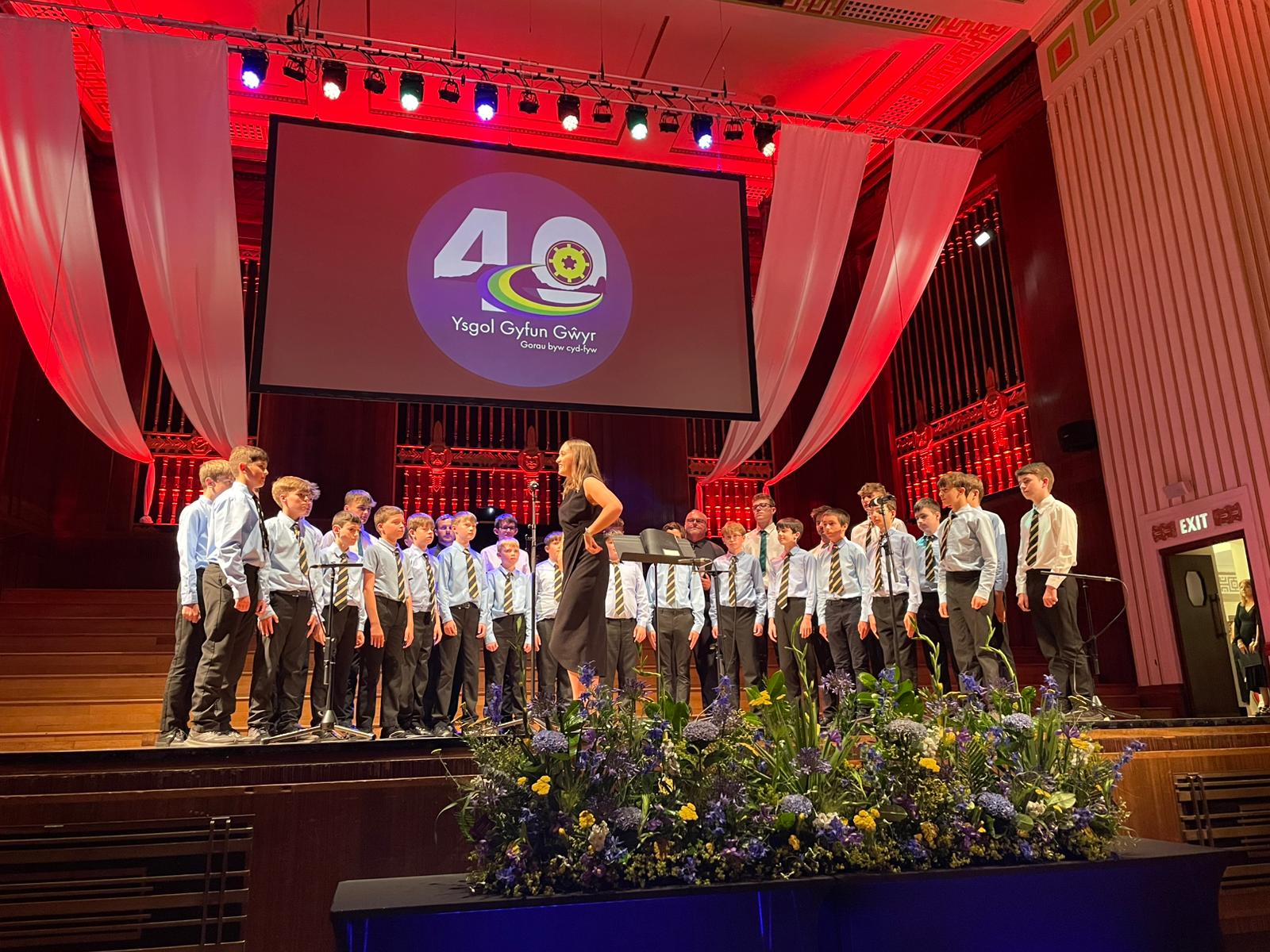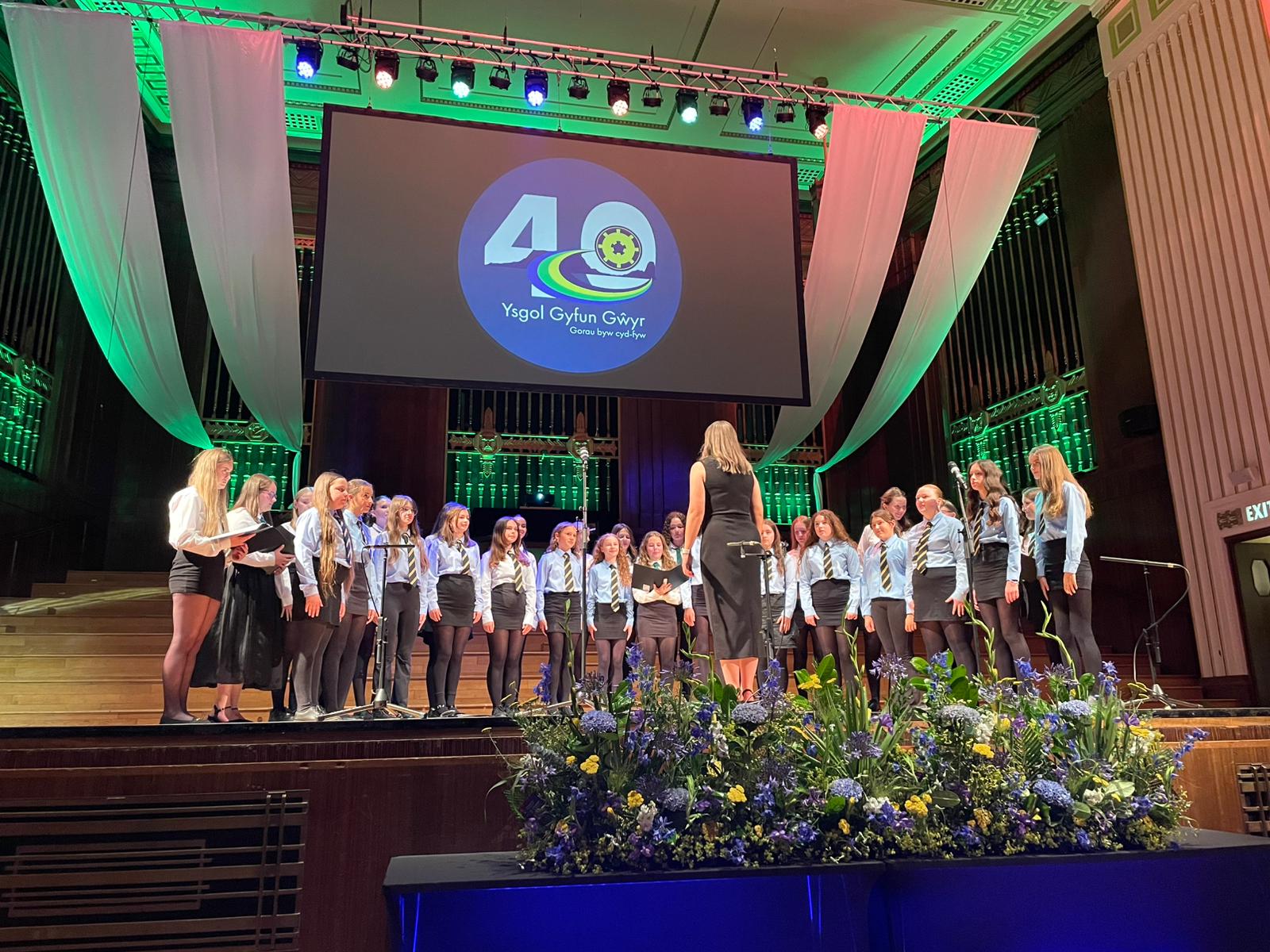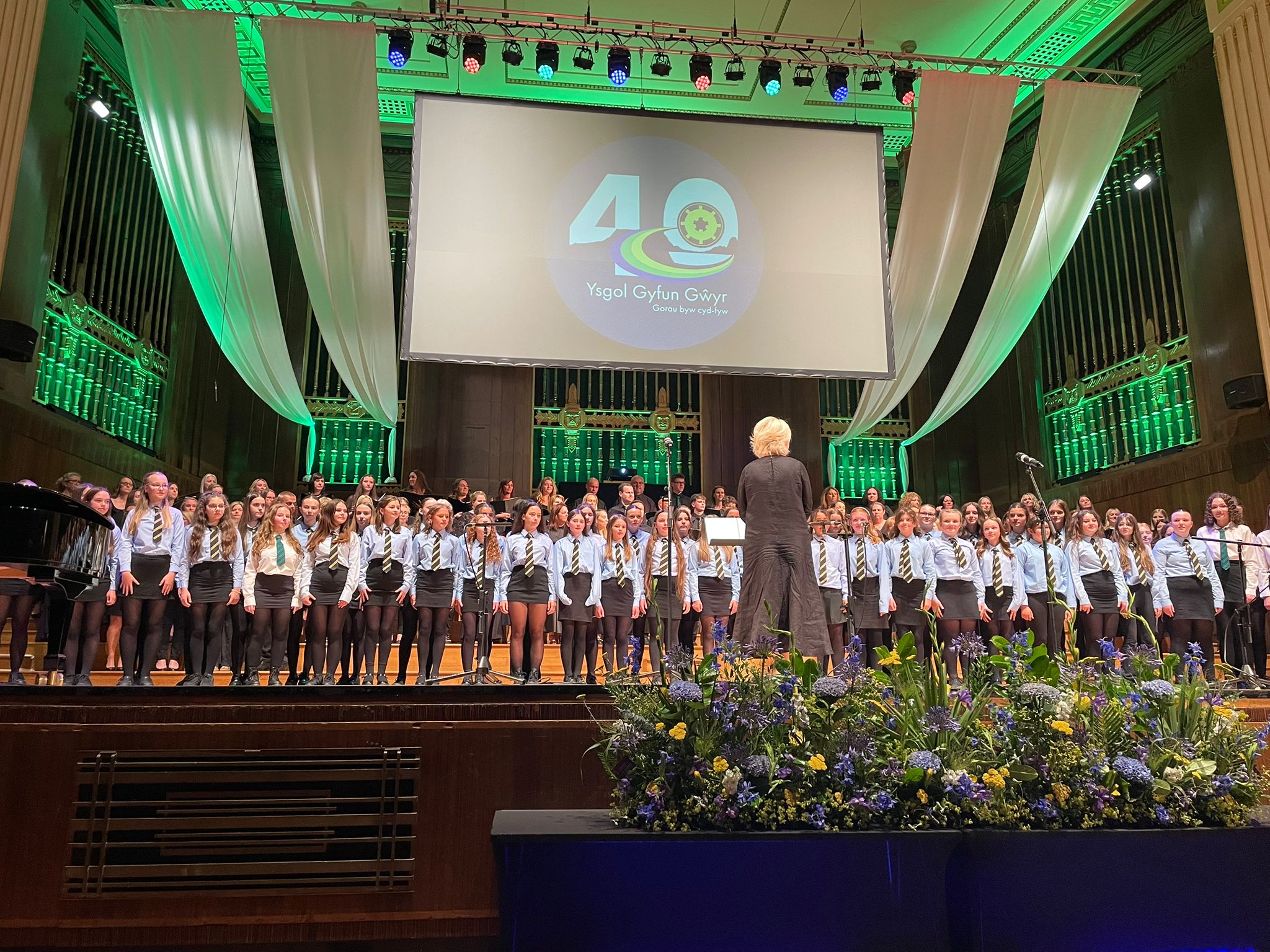 Roedd yn noson fythgofiadwy oedd yn tystio i’r angerdd o fewn teulu’r ysgol a’r parch sydd tuag ati yn ei chymuned ehangach. Braf oedd gweld gymaint o gyfeillion yr ysgol yn rhan o’r gynulleidfa, gan roi cyfle i ddiolch i bawb oedd wedi bod yn rhan o stori’r ysgol dros y 40 mlynedd diwethaf. I gloi’r perfformiadau, cafwyd corau’r ysgol ynghyd i ganu darn newydd, gyda cherddoriaeth gan gyn-ddirprwy yr ysgol, Eric Jones, a geiriau gan y dirprwy presennol, Gareth Williams: ‘Dathlu’r Deugain’. Roedd yn noson emosiynol, wefreiddiol, gyda darllediad rhaglen S4C ‘Heno’ yn tynnu sylw haeddiannol iawn at hanes Ysgol Gyfun Gŵyr ac addysg Gymraeg yn Abertawe. Mae’n diolchiadau’n ddiffuant iawn i Miss Carwen George, Mrs Meinir Richards, Mrs Anne Morris a phawb oedd wedi paratoi disgyblion presennol a chyn-ddisgyblion tuag at adloniant y noson.